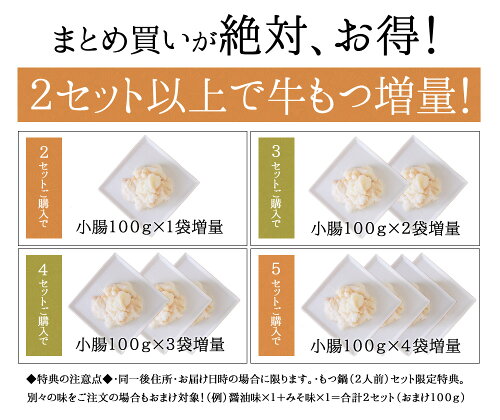 ▼醤油・あごだし醤油・味噌・塩とんこつ・ごま豆乳の場合 ・牛もつ240g ・もつスープ(濃縮)200g ・ちゃんぽん麺2玉 ・煎りゴマ1袋 ・柚子胡椒2袋 ・鷹の爪1袋 ▼胡麻担々の場合 ・牛もつ240g ・もつスープ(濃縮)200g ・ちゃんぽん麺2玉 ・煎りゴマ1袋 原材料 ・牛小腸・赤センマイ・牛ハツ(オーストラリア産・国産) ・もつ鍋スープ原材料一覧はこちら→ ・ちゃんぽん麺(小麦、かんすい、クチナシ色素) ・柚子胡椒・胡麻 賞味期限 冷凍90日間、冷蔵3日間 発送方法 冷凍発送 保存方法 冷凍保存して下さい。